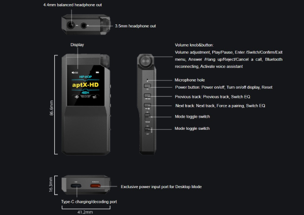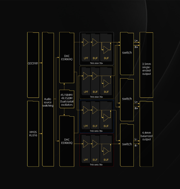 Flagship Qualcomm Bluetooth platform QCC5181, Bluetooth 5.4 Supports LDAC, aptX Lossless | Physical control knob Desktop mode 650mW+650mW powerful output | Dual flagship 10-band high-precision PEQ | XMOS 16-core XU316 Four-way full balanced THX AAA 78+ amps | Multi-stage HiFi audio architecture