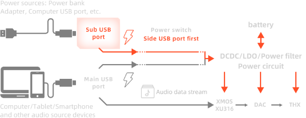 PC (computer sound card): The device is completely powered by the computer.BT (Bluetooth DAC and amp): The device is powered by the internal battery, and when connected to USB can be used for charging and power supply.PHONE (phone dongle): The device’s internal battery participates in power supply, reducing the power consumed from the connected phone.