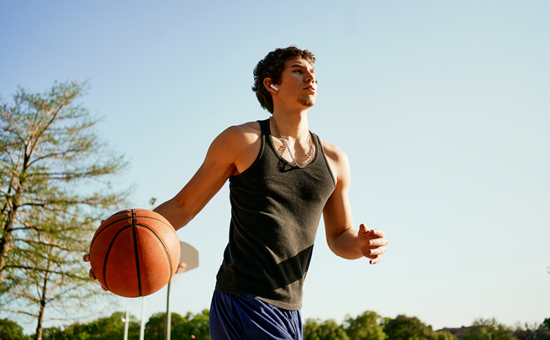 Two mics on each earbud pick up and clearly transmit your voice while canceling out ambient noise. So you can make clear, crisp calls even when you're walking through a busy park on a breezy day.