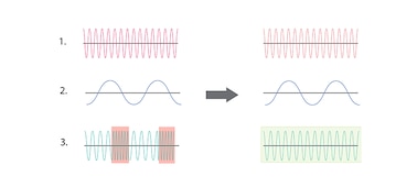 The deeper the bass sound, the more the speaker diaphragm moves. This can cause an effect called phase modulation distortion when a full-range diaphragm needs to simultaneously reproduce higher frequencies. Sony’s unique signal processing technology compensates for this effect for clearer dialogue and more localized sound. The improvements in the modulated waveform enhance clarity and help prevent vocal distortion. This graph is for illustration purposes. 1. Voice waveform 2. Bass waveform 3. Modulated waveform