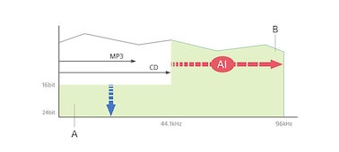 Using Edge-AI (Artificial Intelligence), DSEE Extreme™ (Digital Sound Enhancement Engine) upscales compressed digital music files in real time. Dynamically recognizing instrumentation, musical genres and individual elements of each song, such as vocals or interludes, it restores the high-range sound lost in compression for a richer, more complete listening experience. A = Expanded audio dynamics (strings and whisper-quiet subtleties) B = Restored high frequencies (acoustic and vocal instrument realism)