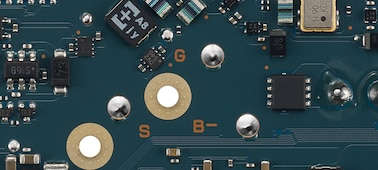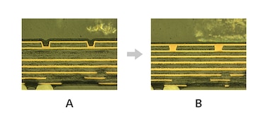 The printed circuit board uses low dielectric material to realize accurate signal transmission, while the via holes are filled with copper to further reduce impedance. The result is a wide sound space with clear, bright sound. [A] Normal via [B] Filled via