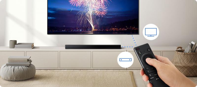 Your Samsung TV remote isn’t just for the TV. Use it to control key Soundbar functions like power, volume and sound effects.