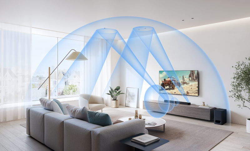 Made for movie lovers, this soundbar delivers 3.1.2ch of Dolby Atmos®, DTS ®, and up-firing speakers to surround you in expansive sound. The subwoofer adds deep, powerful bass alongside clear centre speaker dialogue to immerse you in every scene.