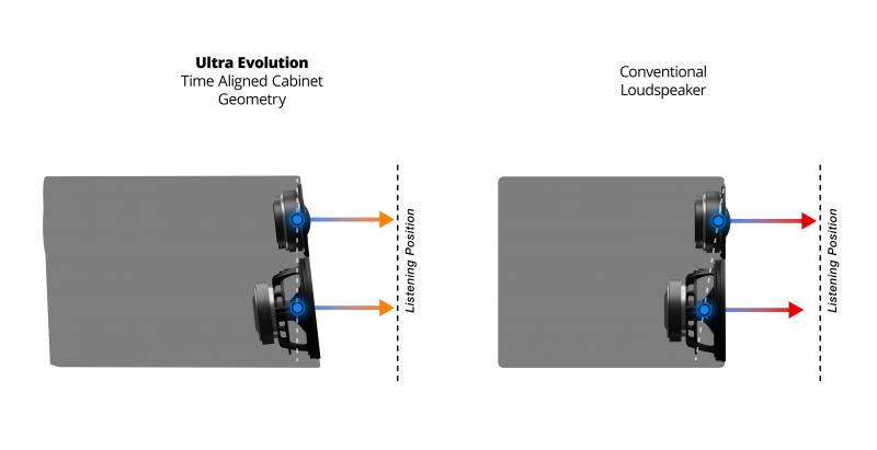 - Time-aligned cabinet geometry introduces microsecond-level time delays between the drivers, ensuring that the effective-acoustic-center of each driver is equidistant from the listener. The result is improved linearity and directionality throughout the crossover frequencies, and a more accurate soundstage.