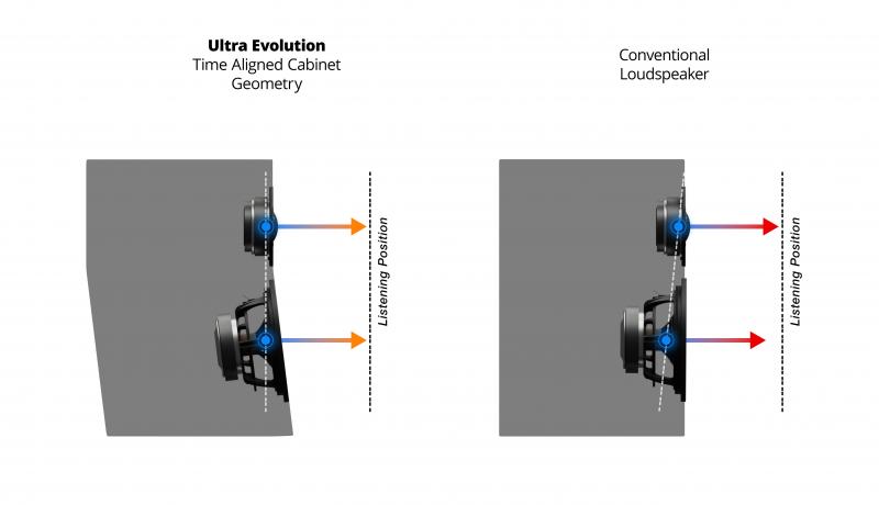 - Time-aligned cabinet geometry introduces microsecond-level time delays between the drivers, ensuring that the effective-acoustic-center of each driver is equidistant from the listener. The result is improved linearity and directionality throughout the crossover frequencies, and a more accurate soundstage..