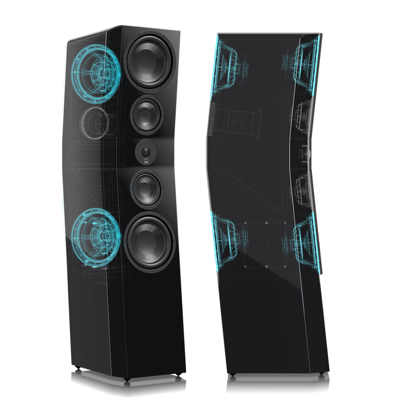 - Acoustically-centered architecture orients the mid-range and woofer arrays in rotational-symmetry around the tweeter, ensuring that low, mid, and high-frequencies emanate from the same effective point in space, creating a coherent, integrated, faithful acoustic image.