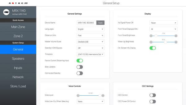 Anthem Web User Interface is now built in to all MRX Receivers and AVM Processors. Using a phone, tablet or laptop, owners can easily access any function or setting and make changes on the fly. Power the main or second zone on and off, adjust volume, change audio modes or tweak channel trims for a perfect surround sound experience. Web UI can also be used to calibrate speaker delays and levels and configure network settings/control options. Source devices can be renamed, simplifying set up by enabling the elimination of unused inputs. Installers can import and export files to make remote management simple and convenient.
