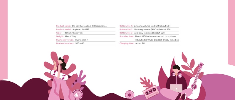 Anytime supports ANC noise canceling technology*, which allows for a good listening and call experience even in noisy environments. No matter if you’re out in noisy areas, such as subways or shopping malls, or in areas where you need every last bit of concentration, such as dorms and libraries, just press the ANC button and instantly hide in your own little world, away from any distractions.
