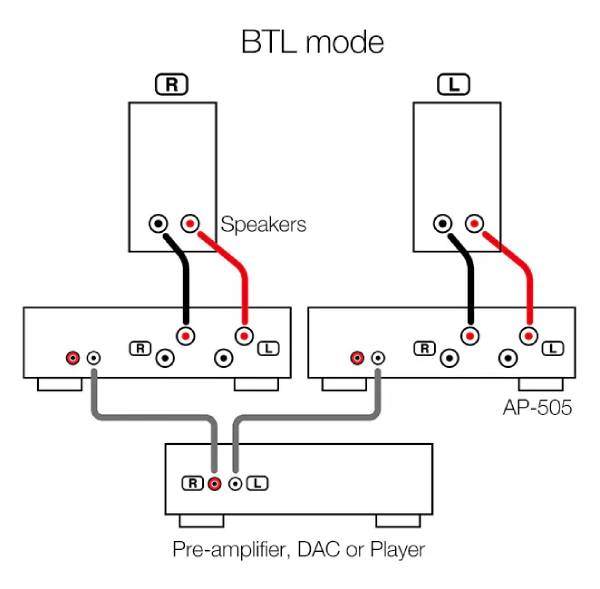 Not only for conventional stereo mode with 130W + 130W of output power, this compact unit also provides versatile speaker drive modes, Bi-amp, and BTL modes by deploying a couple of AP-505 units side by side. The Bi-amp mode drives woofer and tweeter independently, while the BTL modes produce 250W of output power in each channel.