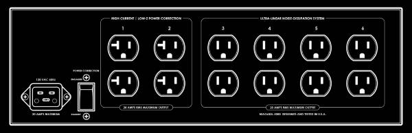 6 isolated AC power outlet banks with 16 amp RMS average (@220-240VAC 50/60Hz) current capacity. These outlets utilize high spring-strength beryllium copper base metal with heavy silver-plated contacts. This assures far lower loss and distortion, while providing a superior means of draining radio frequency noise.