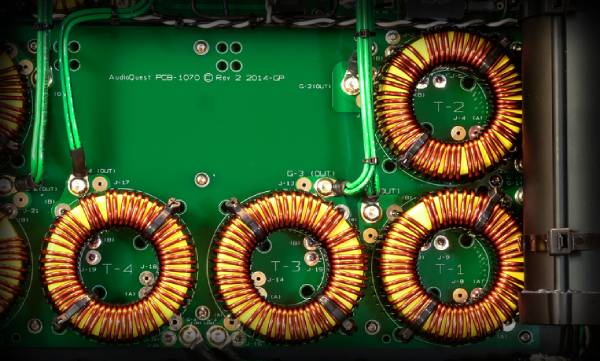 6 discrete circuits isolate, drain and absorb (through loss networks), the RF induced noise that masks audio and video signals. This is critical as the AC ground is directly connected to component circuit ground. Employed in concert with our Ultra-Linear filters and direction oriented, grain-controlled AudioQuest AC cables, this ensures the highest resolution and lowest distortion performance from your system components.
