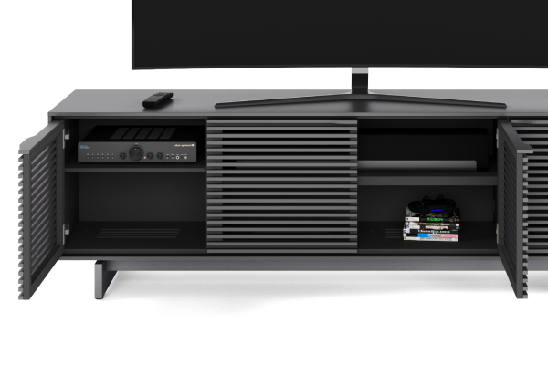 Louvered doors conceal a host of storage for your gear—keeping electronics neatly out of sight—while allowing for clear sound dispersal and remote control accessibility.