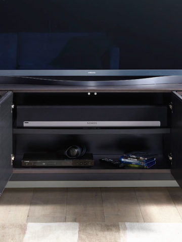 Louvered doors conceal a host of storage for your gear, keeping electronics neatly out of sight but easily accessible via remote control.