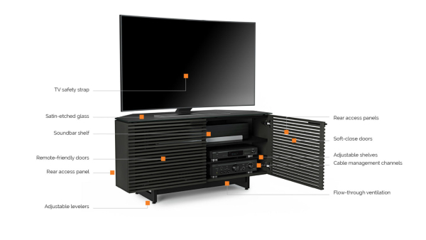 A perfectly positioned soundbar shelf integrates a speaker — and full sound dispersion — into the overall design.