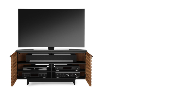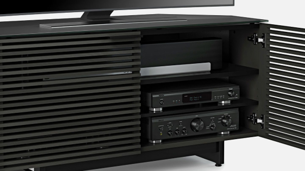 Designed with the home theater in mind—yet beautifully crafted furniture in its own right—the award-winning Corridor collection is the star of any living space. Louvered hardwood doors conceal a host of user-friendly features, sharply contrasted with a satin-etched glass top and black steel base.