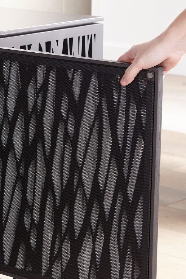 Precisely cut doors are backed with perforated metal, keeping contents ventilated, accessible, but out of sight. Magnetically attached, the metal backing is removable for easy cleaning.