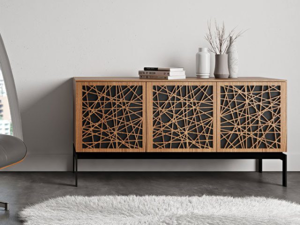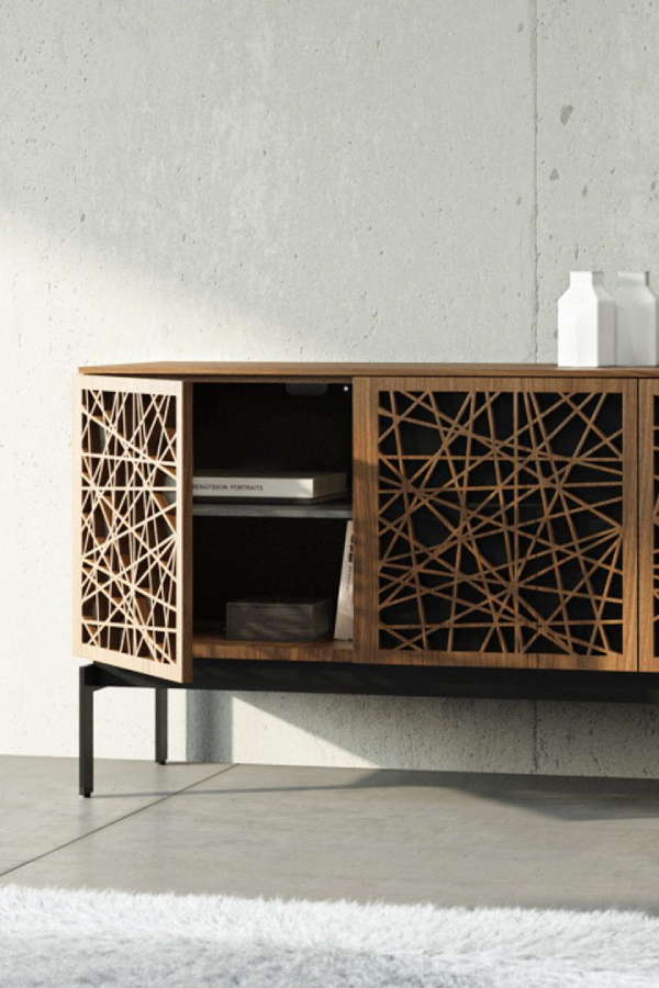 Laser-cut doors in three unique patterns keep contents concealed, organized, and beautifully out of view.