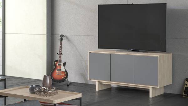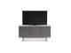A full-featured triple-width media cabinet with perforated steel doors, allowing remote-control signals in, while evenly dispersing sound out.