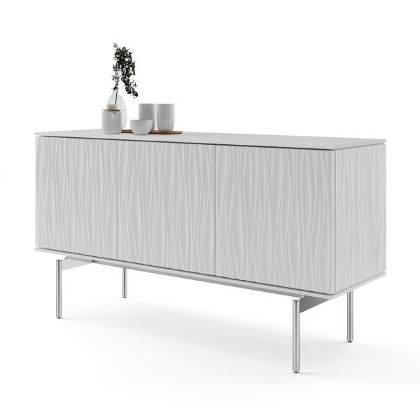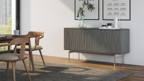 Contrasting straight lines with flowing, sculpted door patterns, this stunning modern console is sure to be a conversation starter, whether used for storage, in a dining room, or as a TV cabinet. Available in two cabinet sizes.