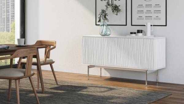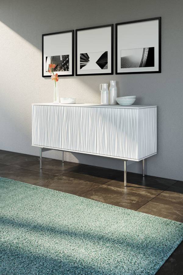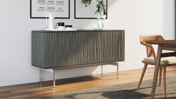 Contrasting straight lines with flowing, sculpted door patterns, this stunning modern console is sure to be a conversation starter, whether used for storage, in a dining room, or as a TV cabinet. Available in two cabinet sizes.