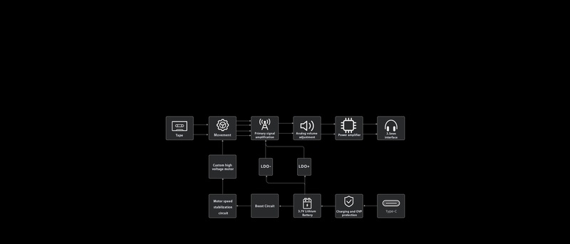 Unlike the single-ended signal acquisition typically found in current cassette players, the CP13 employs a differential circuit for balanced acquisition of signals from the head, ensuring more stable signal transmission, higher signal-to-noise ratio, and lower distortion.