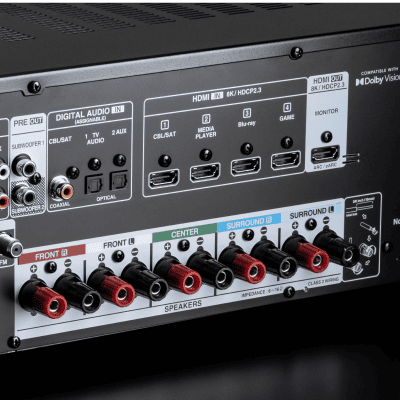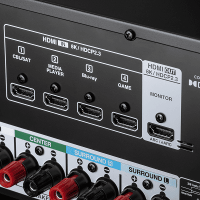 8K/60Hz, 4K/120Hz, HLG, HDR, Dolby Vision, HDR10+ pass-through, and 8K upscaling are supported on all four HDMI inputs and one output, for maximum bandwidth up to 40Gbps.