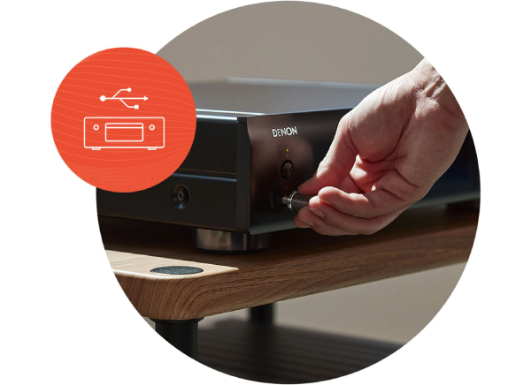 USB-DAC input allows connection to a computer to access high-resolution audio files, supporting hi-res up to 11.2-MHz DSD and 384-kHz/32-bit PCM input signals.