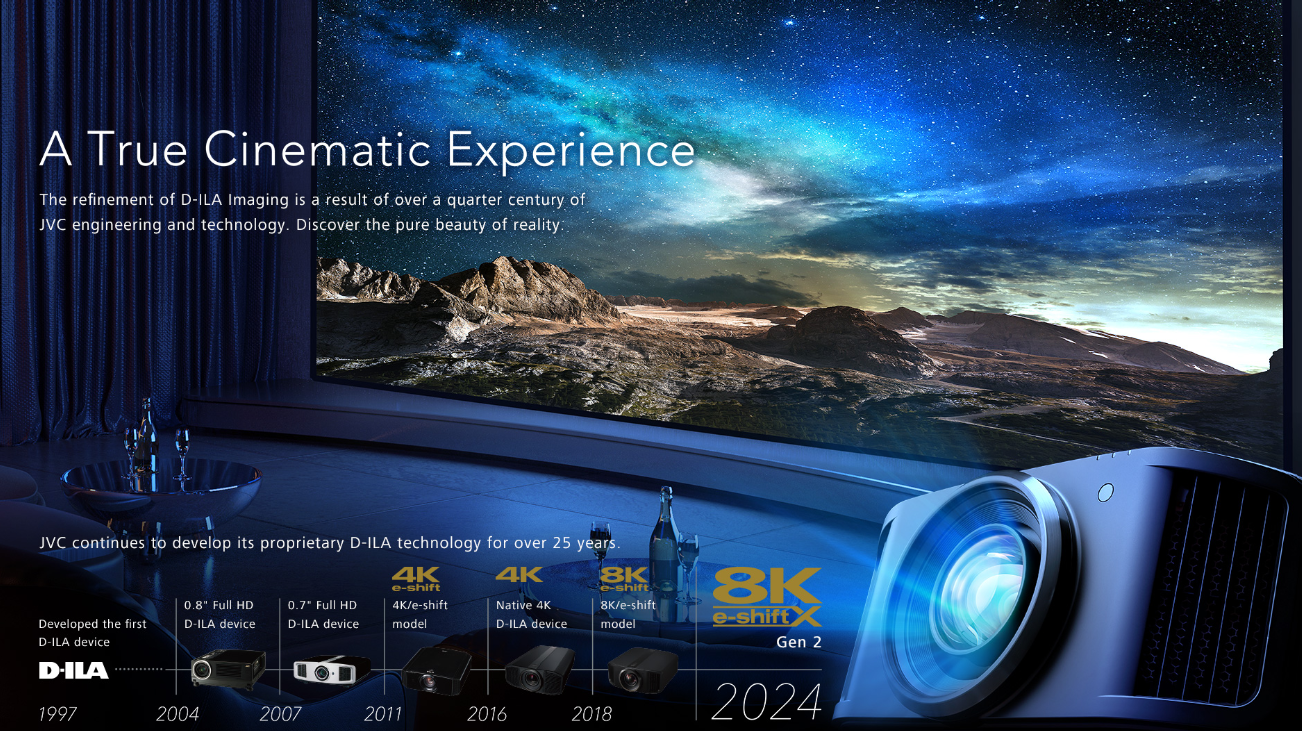 JVC’s proprietary 8K/e-shiftX, which is a combination of “e-shift technology” – a high-resolution display technology that doubles the resolution by shifting a pixel by 0.5 pixels in four directions up, down, left, and right – and “0.69-inch native 4K D-ILA devices” has made significant progress as the second generation 8K/e-shiftX. The latest version features JVC's newest 8K scaling engine that drastically improves the projector’s sharpness and detail across a wide range of content, including 8K (8192 x 4320 pixels) sources.