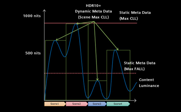 In HDR10, the basic standard for reproducing HDR content, there are only two pieces of information: MaxCLL, which represents the maximum brightness of the content, and MaxFALL, which represents the average maximum brightness. However with HDR10+, the luminance information for each scene is embedded in the content as metadata, which allows for scene-specific tone mapping and faithfully reproduces the HDR image intended by the creator.