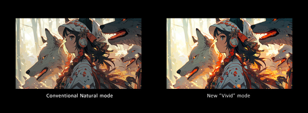 To reproduce SDR content with a narrow dynamic range in more saturated colors, conventional Natural mode has been improved to the new “Vivid” mode. This mode is excellent for projecting SDR animated works that are popular in streaming content and gaming CGs with greater vividness.