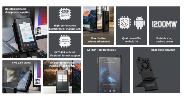 Desktop/portable dual power supplies | High-performance ES9038PRO DAC QCC5124 with full Bluetooth format support | Qualcomm 660+Android 10 1200mW+1200mW continuous output power | DK3S dock included Five gain levels| Six operating modes including Roon Ready