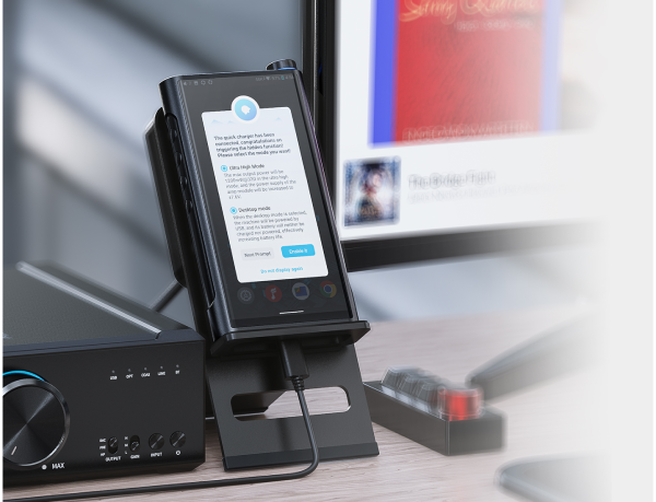 The M15S not only features the “desktop/portable dual power supplies” as seen in other FiiO products, it is also equipped with an automatic “auxiliary DC power supply” – the M15S is able to automatically recognize when fast charging* through USB is being used and automatically switches to use the highest-voltage power supply, leading to an increase of 26.67% in power supply for even more power output. Even when not using the fast-charging adapter, the M15S can still automatically switch to a higher-voltage power supply that is enough to drive most headphones.