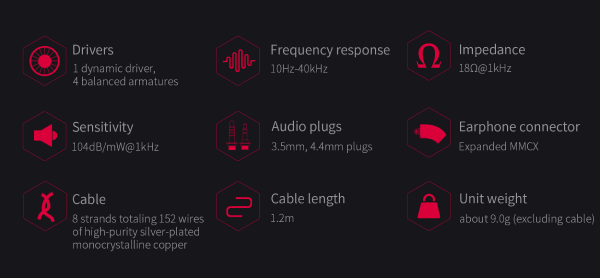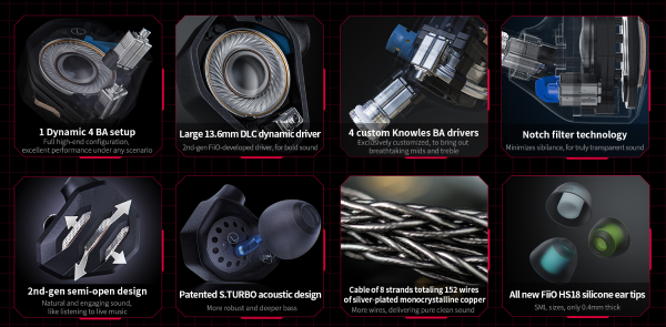 1 Dynamic 4 BA setup | Large 13.6mm DLC dynamic driver | 4 custom Knowles BA Sci-Fi armor design | Unique notch filter| 2nd-gen semi-open design | 3 tuning filters New FiiO silicone ear tips HS18 | Patented S.TURBO acoustic design 8 strands totaling 152 silver-plated monocrystalline copper wires Twist-lock swappable audio plugs