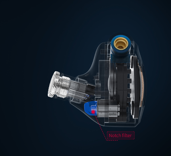 Using finite element analysis and after numerous experiments, the development team created a unique notch filter for the FH7S. The notch filter precisely guides sound waves to eliminate unwanted resonances between the shell, sound tube, and ear canal to suppress undesirable sibilance - resulting in a detailed, transparent yet unfatiguing sound.