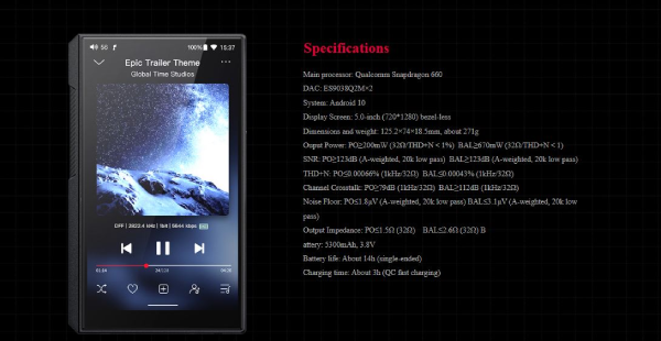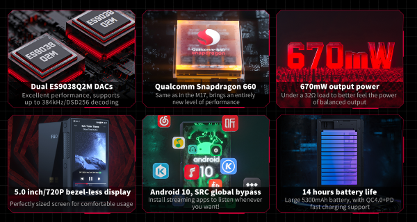 | Special Features | High performance dual ES9038Q2M DACs | 670mW output power | 14 hours battery life Qualcomm Snapdragon 660 | 5.0 inch/720P bezel-less display | Android 10, SRC global bypass |