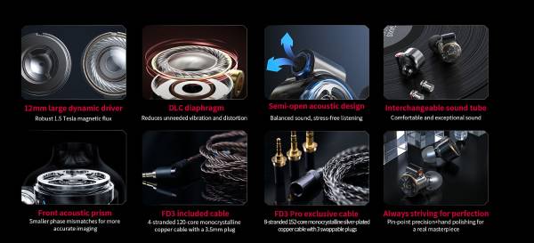 The FD3/FD3 Pro follows in the footsteps of its FD line siblings in using a newly designed 12mm flagship-level dynamic driver.Inside the FD3/FD3 Pro's striking shell lies a driver with a robustmagnet of 1.5 Tesla magnetic flux paired with an ultra-finecopper-clad aluminum Japanese Daikoku voice coil for an amazing,powerful sound.