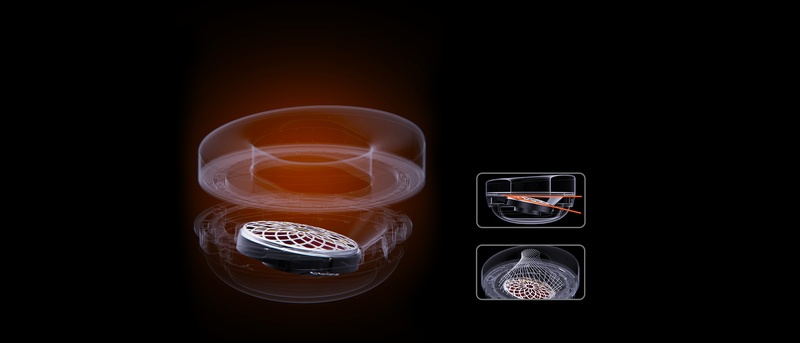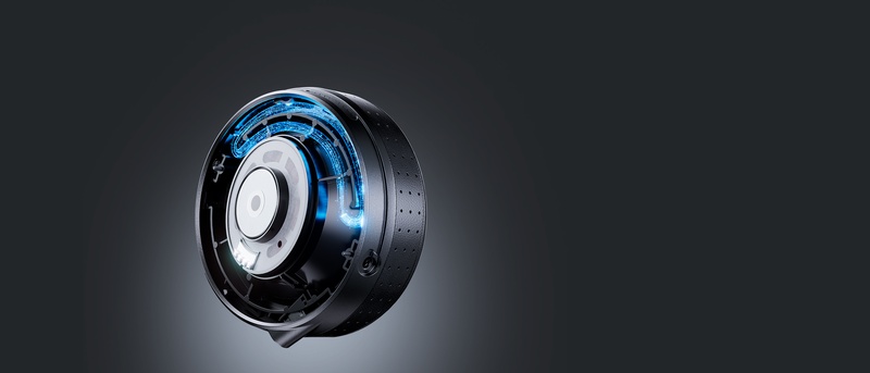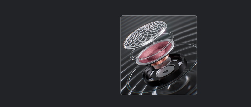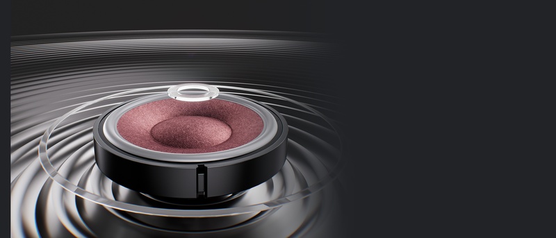 The headphone features a W-shaped diaphragm design inspired by speaker cones. Compared to the driver diaphragms typically found in headphones, this design increases the effective vibration area of the diaphragm by 25.8%. The diaphragm is made from a hard dome and a flexible surround. This rigid dome covers a larger surface area than traditional diaphragms, and since the voice coil drives it directly, there is less energy lost during vibration transfer. Compared to a more flexible material, the hard dome features reduced internal loss, resulting in higher efficiency and reduced distortion caused by driver breakup.