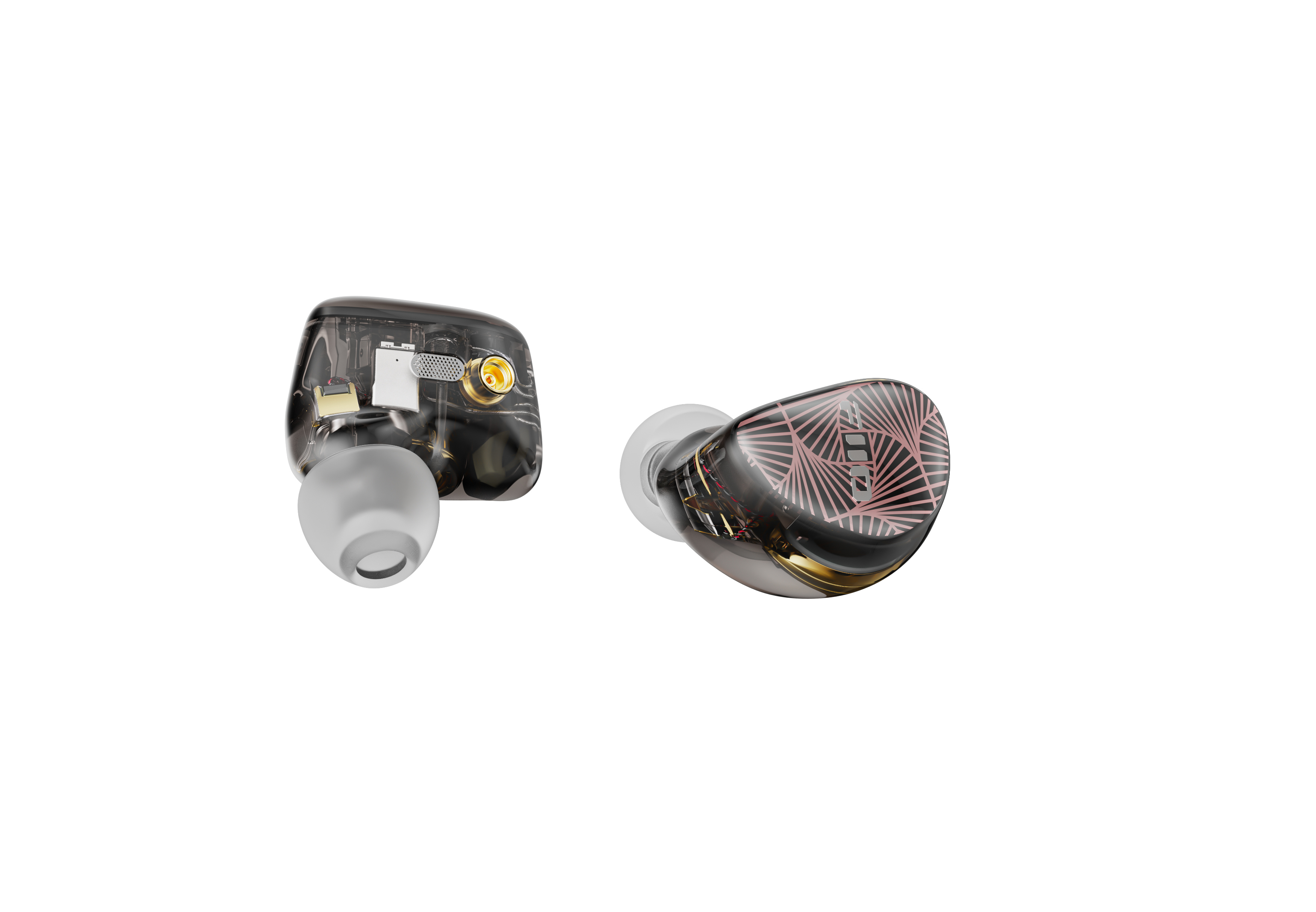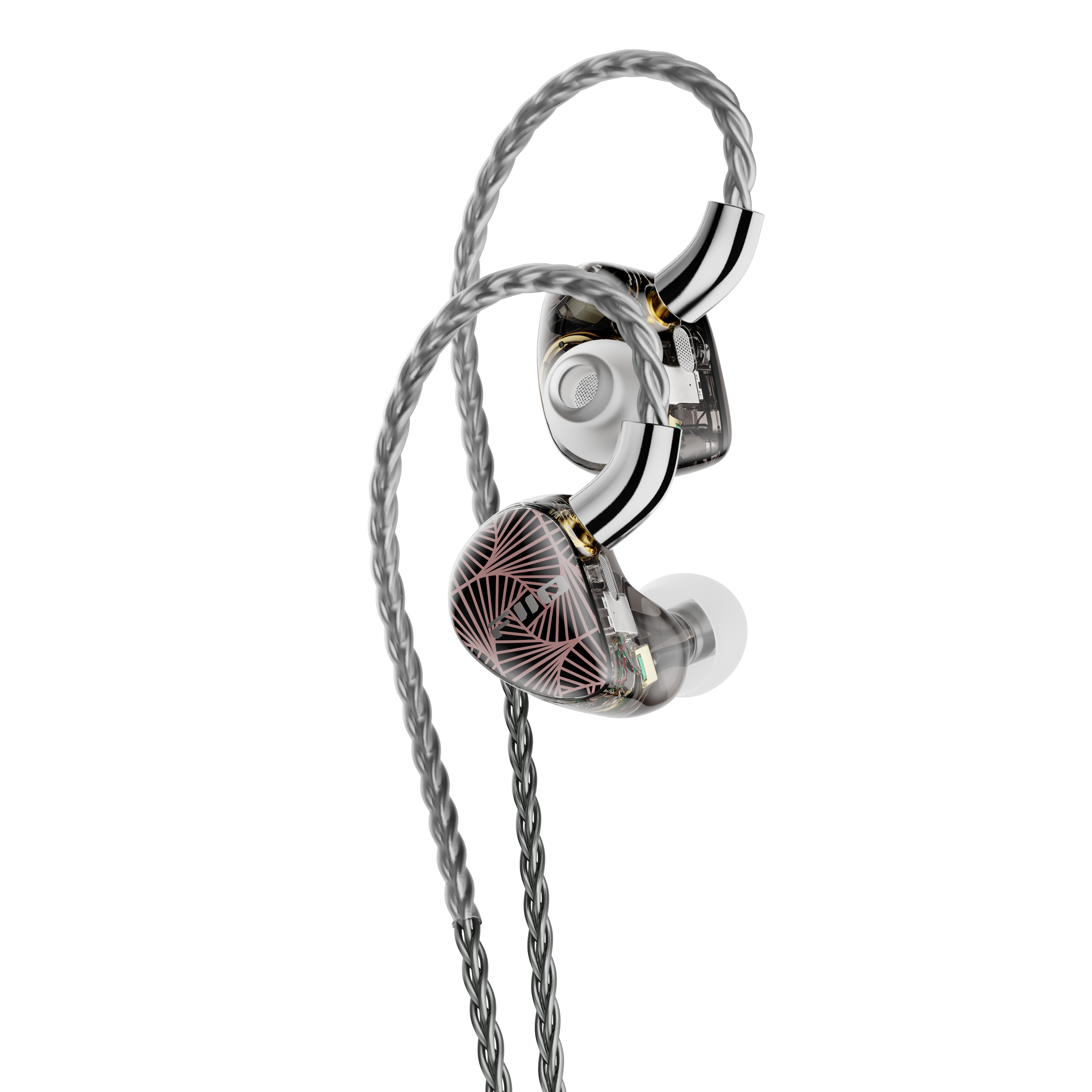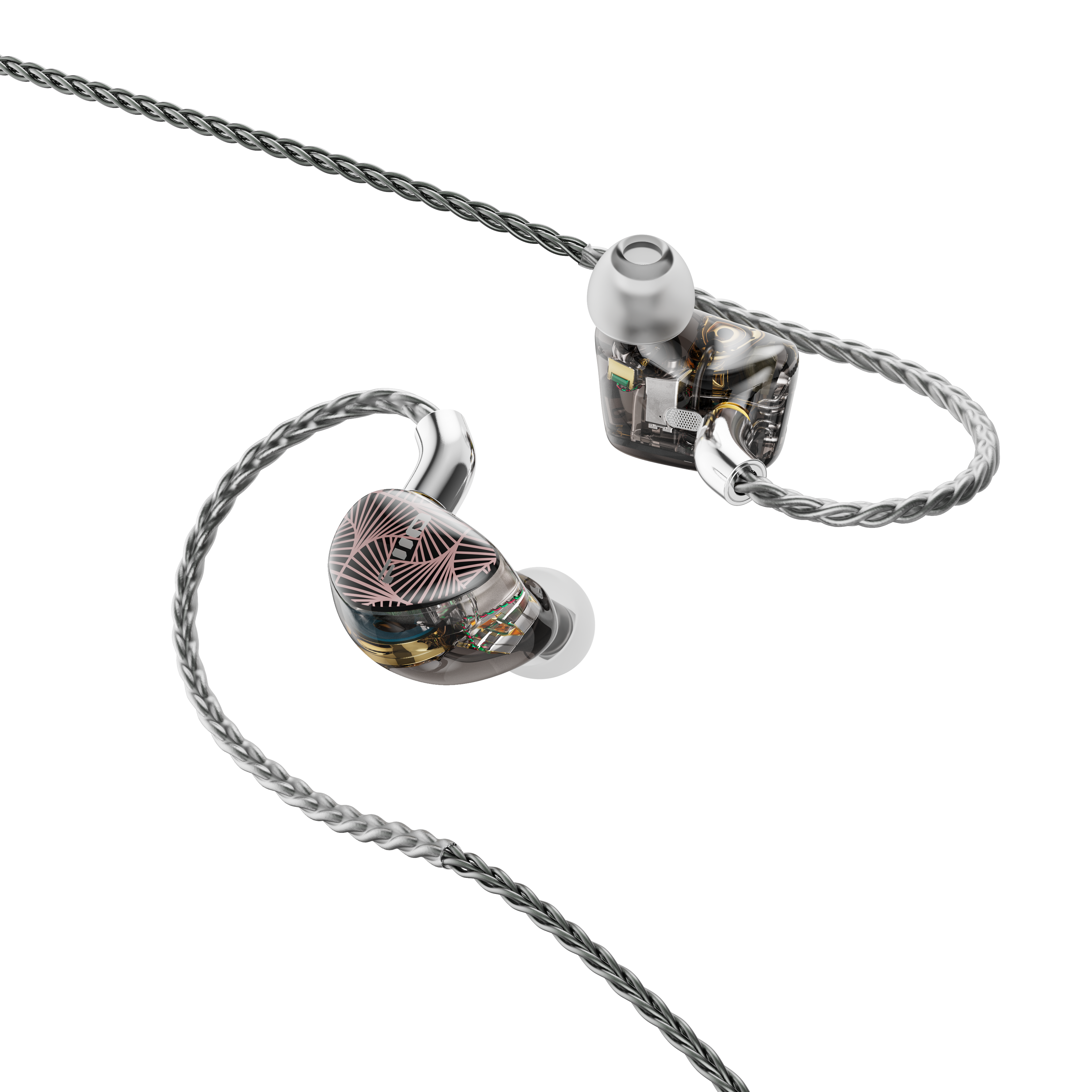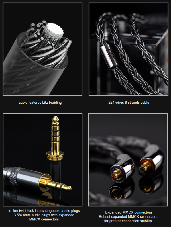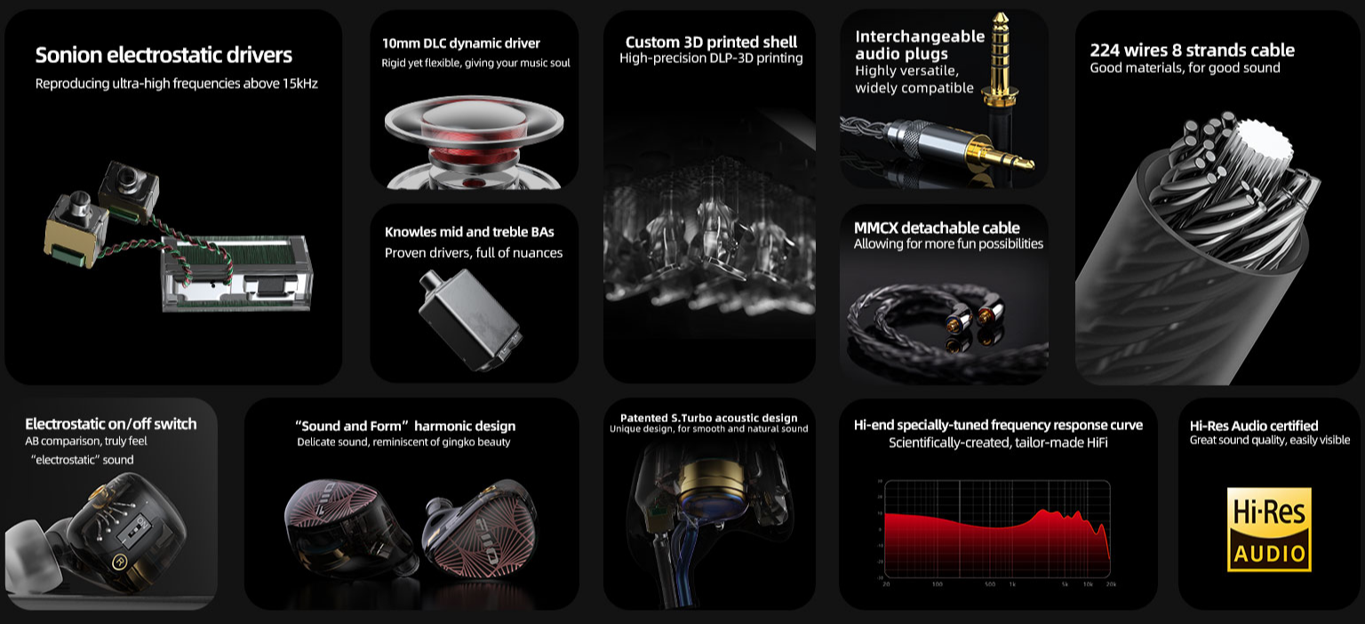 Sonion electrostatic tweeters | Knowles mid and treble BAs | 10mm DLC dynamic driver Electrostatic on/off switch | 「Sound and Form」harmonic design | Custom 3D printed shell 224 wires 8 strands cable | MMCX detachable cable | Interchangeable audio plugs Patented S.Turbo acoustic design | Hi-end specially-tuned frequency response curve