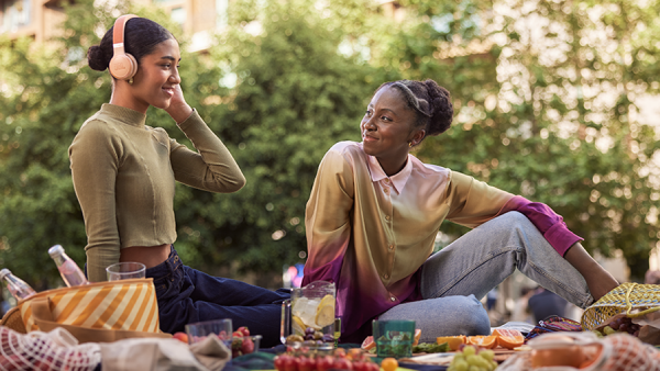 Soft ear cushions and a textured, fabric headband in earthly shades make these headphones comfortable and unique. And when you do take them off, they have a comfy and protective place to live that's easy to pull out of your bag.
