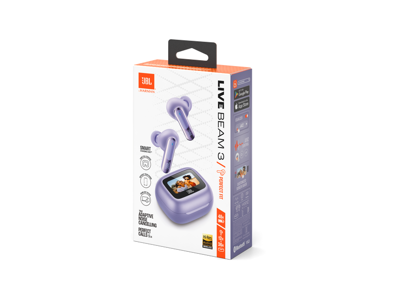 Get customized sound without ever looking at your phone. Use the controls on the Smart Charging Case™ of the JBL Live Beam 3 true wireless noise-cancelling earbuds with Hi-Res Audio to customize all their features without opening the JBL app on your device. Adjust volume and EQ, control your music, take phone calls, see messages—you can even customize the screensaver with your favorite photos. And that’s before you even get to enjoy the monumental JBL Signature Sound of the Live Beam 3 earbuds themselves. Best-in-class True Adaptive Noise Cancelling tunes out distractions. JBL Spatial Sound makes movies and music truly immersive. And if you have to take a call, 6 mics ensure perfect sound quality even in the noisiest surroundings. All this plus a 48-hour charge: 12 hours in the buds* and another 36 in the case—and they can charge wirelessly. The charging case features a loop to attach a lanyard for even more convenience. Great sound has never been simpler. (*with ANC off)