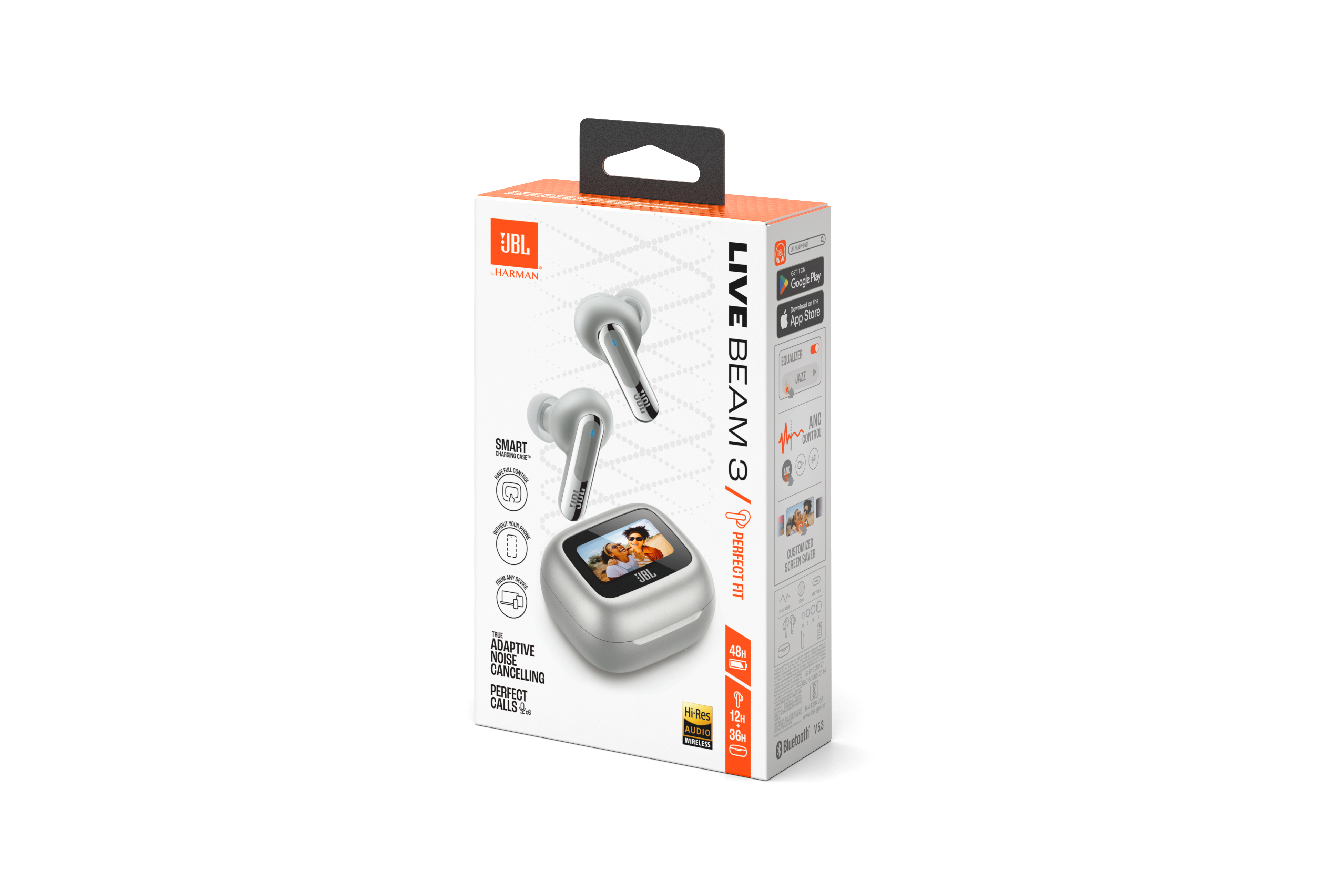 Get customized sound without ever looking at your phone. Use the controls on the Smart Charging Case™ of the JBL Live Beam 3 true wireless noise-cancelling earbuds with Hi-Res Audio to customize all their features without opening the JBL app on your device. Adjust volume and EQ, control your music, take phone calls, see messages—you can even customize the screensaver with your favorite photos. And that’s before you even get to enjoy the monumental JBL Signature Sound of the Live Beam 3 earbuds themselves. Best-in-class True Adaptive Noise Cancelling tunes out distractions. JBL Spatial Sound makes movies and music truly immersive. And if you have to take a call, 6 mics ensure perfect sound quality even in the noisiest surroundings. All this plus a 48-hour charge: 12 hours in the buds* and another 36 in the case—and they can charge wirelessly. The charging case features a loop to attach a lanyard for even more convenience. Great sound has never been simpler. (*with ANC off)