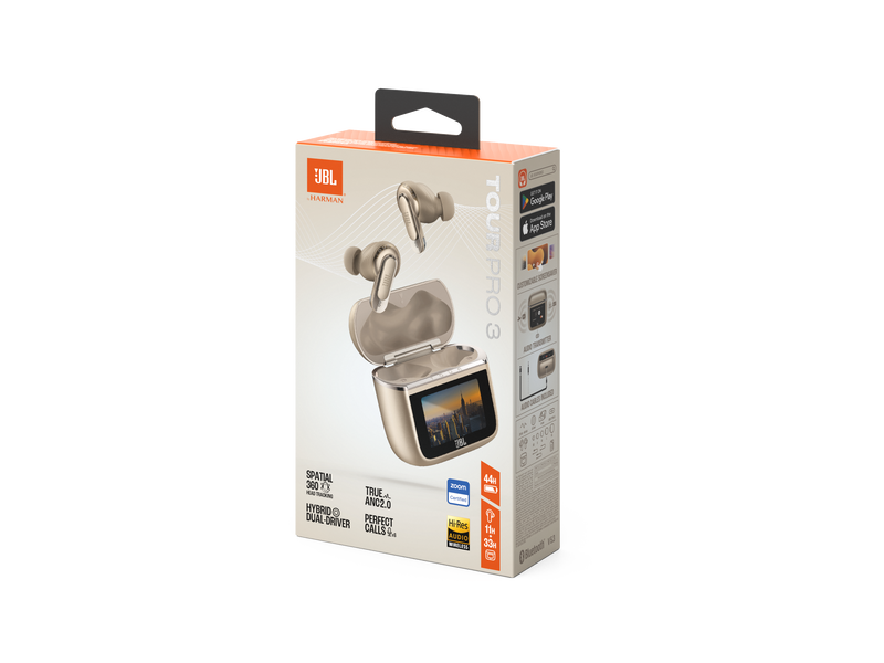 Get ready for the smartest True Wireless earbuds yet. JBL Tour Pro 3 earbuds come in a newly redesigned Smart Charging Case™ with a handy and more feature-packed touchscreen, giving you full control over your listening experience—while your phone stays in your pocket. Connect seamlessly with any Bluetooth® device and immerse yourself in your music, movies, and games with JBL Spatial 360 sound with head tracking. The JBL Tour Pro 3 are also powered by legendary Hi-Res JBL Pro Sound. When it’s time to work, tune out the world with Real-Time True Adaptive Noise Cancelling. On a flight, use the Smart Charging Case™ as an audio transmitter dongle to wirelessly connect to the inflight system (or PC) and enjoy cinematic sound experience while you're in the air. Or at your desk, easily connect the Smart Charging Case™ to your computer, for perfect call quality.