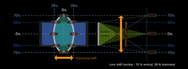 Fully electric (Zoom, Focus, Shift), with 70% vertical and 28% horizontal shifts for easy installation.