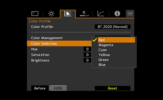 A 6-axis matrix of red, green, blue, cyan, magenta, and yellow enables the precise adjustment of hue, saturation, and intensity. Users can make adjustments suitable for the content as the projector allows precise management of colors.