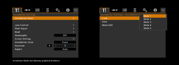 These projectors are equipped with Installation Mode that allows users to centrally manage settings related to installation in order to enjoy projected video optimized for each environment. As shown in the graphical interface, eight settings for Lens Control, Pixel Adjustment, Mask, Anamorphic on or off, Screen Setting, Installation Style, Keystone, and Aspect can be adjusted. Additionally, 5 different mode settings can be stored in memory and named as desired. Installation modes stored in memory for various environments can be called up immediately.