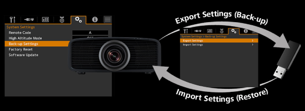 The USB Back-up function can save and write settings on the main unit menu to a third-party USB flash drive all at once. It is important to save adjustments made by an installer or specialist, or to undo unintended adjustments made by children or family members.