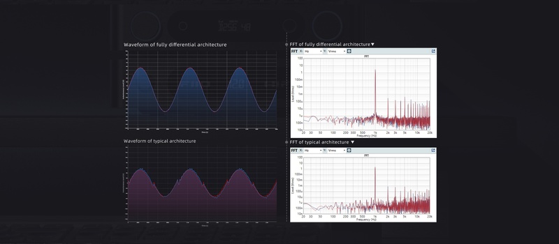 The K13 R2R employs a fully differential architecture that leads to lower noise, and fewer FFT harmonics, resulting in a darker music background.