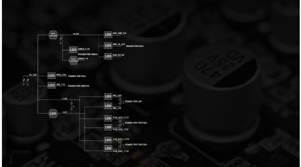 The K7 features a power design consisting of multiple independent stages, with a voltage of each stage being regulated by low-noise LDOs. Feeding this power design is an external 12V switching power supply. All in all, the K7’s power design is designed to supply plentiful, clean power for an extraordinary listening experience.