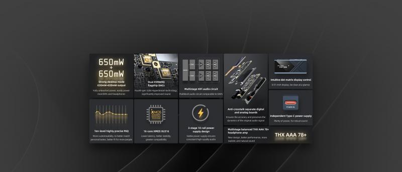 Machine Mode 650mW 650mW Strong Thrust | Dual Channel Flagship DAC ES9069Q * 2 Ten-segment high-precision PEQ adjustment | professional grade XMOS 16 core XU316 Four-way fully balanced THX AAA 78 amp | Multi-level HiFi audio architecture | Anti-crosstalk design of digital-analog split board Three-level ten-channel precision power supply design | humanized dot matrix screen interactive system | independent Type-C power supply interface